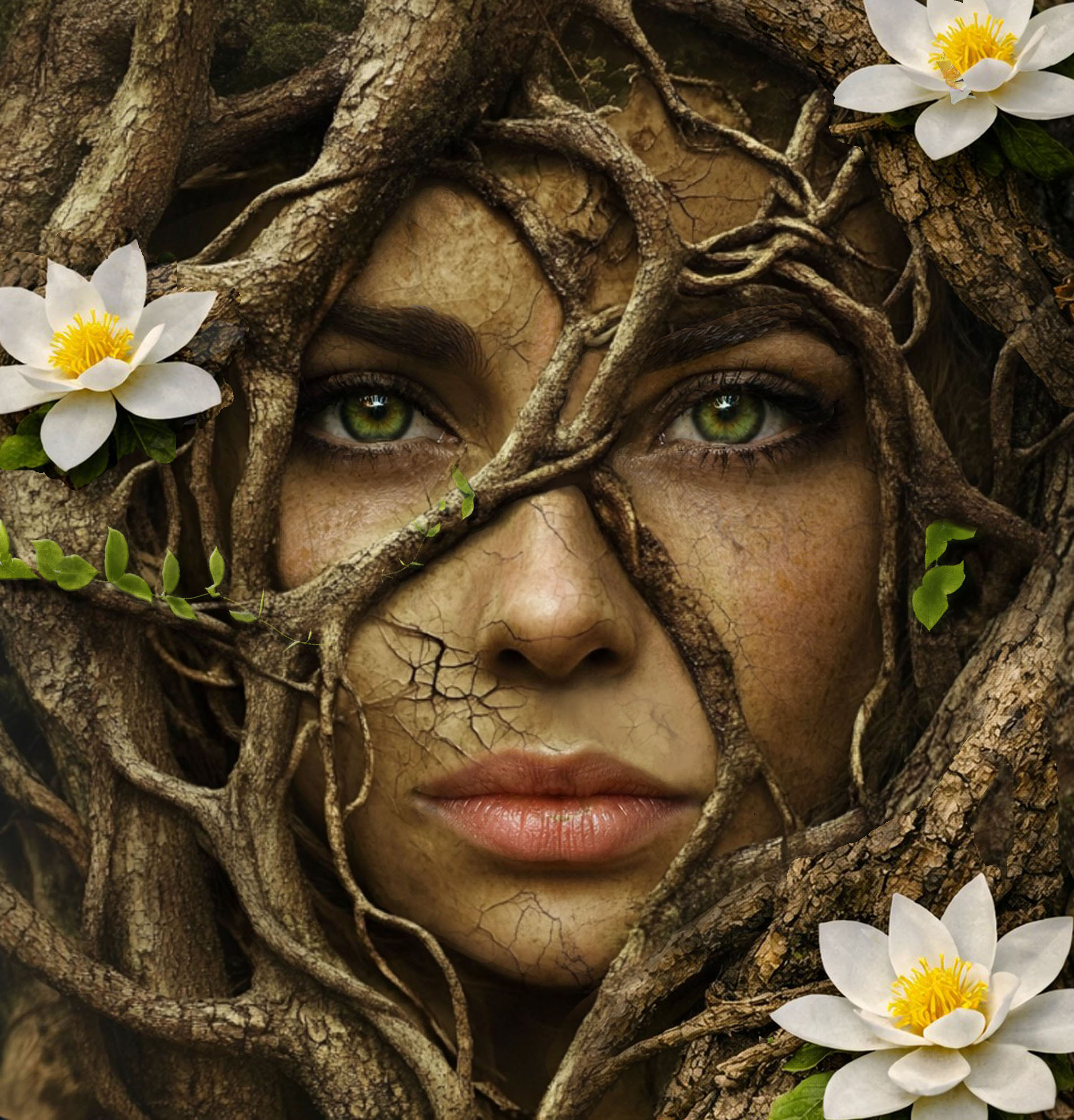 In Nature’s Eternal Embrace, a woman’s face emerges through a network of ancient roots that twist across her skin like the living veins of the earth itself. Her presence feels both human and elemental, as if the boundary between person and planet has dissolved. The roots do not merely surround her—they reclaim, reminding the viewer that the earth is not something separate from us, but something we ultimately return to.