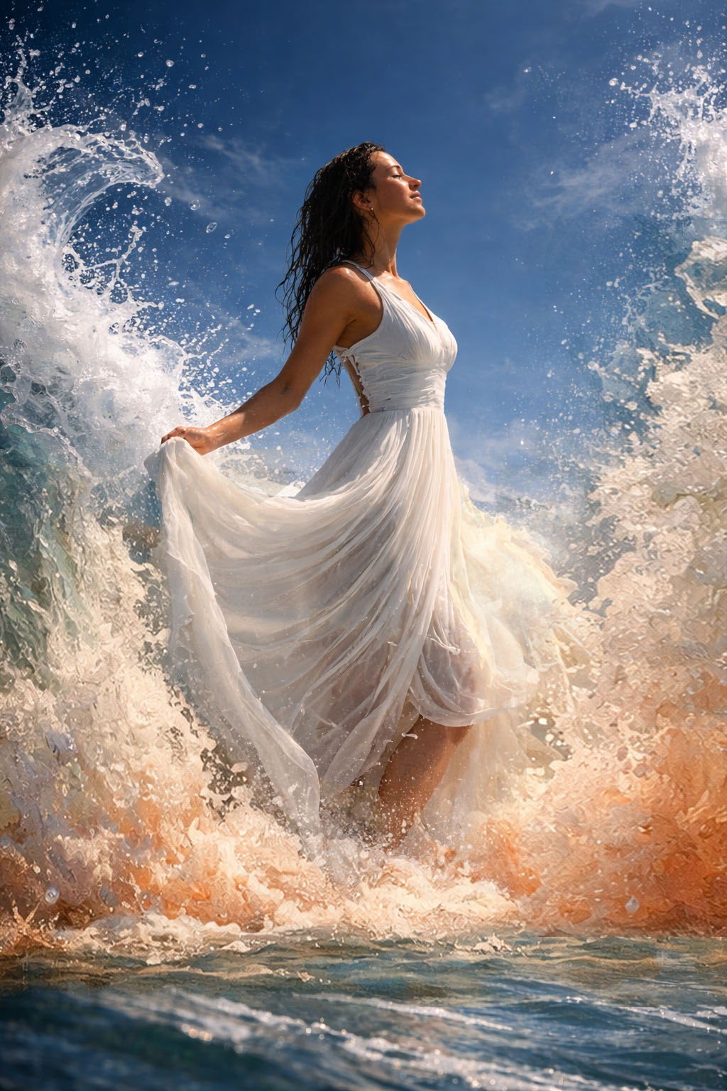 In this luminous composition, a woman in a flowing white dress rises through crashing ocean waves beneath an open sky. Water surges around her, yet she stands calm and radiant within the movement of the tide. The image symbolizes rebirth, personal awakening, and the quiet strength that emerges when we rise beyond life’s emotional storms.